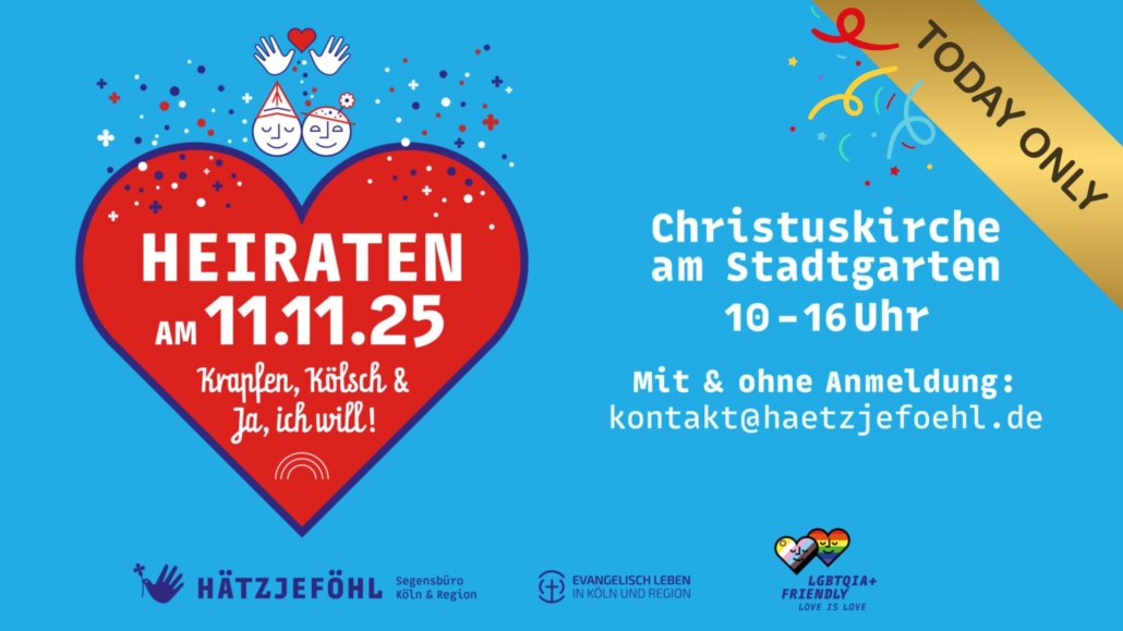 Segen, Musik und jede Menge kölsches Lebensgefühl – am 11.11. in der Christuskirche Köln. Das Segensbüro Herzgefühl freut sich über jedes Paar, das sich traut, auch mitten im Karneval „Ja“ zueinander zu sagen. Alle Infos gibt’s unter www.haetzjefoehl.de.