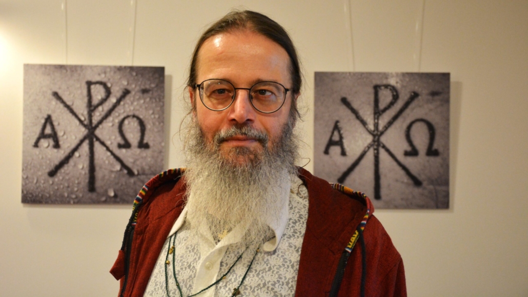 Er ist Mitglied der Evangelischen Michaelsbruderschaft, die seit 1931 Brüder aus verschiedenen Konfessionskirchen zusammenführt. An diesem Abend diskutierte er mit Studierenden über „Tattoos als Glaubenszeugnisse“. Schmidt trägt ein Christus-Symbol als Tattoo, das auf drei Fotos in der Ausstellung gezeigt wurde. Einmal ist es mit Öl gesalbt, einmal mit Wasser bespritzt und einmal mit Asche eingerieben. Das symbolisiere die heilende Kraft Gottes, erklärte der Künstler.